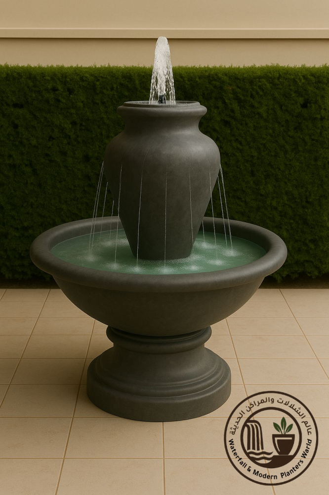 يمتزج التصميم الكلاسيكي للجرة مع قاعدة دائرية متينة، مما يمنح النافورة حضوراً بارزاً يضفي أجواءً من الراحة والهدوء في الحدائق، الفناءات أو حتى المساحات الداخلية.