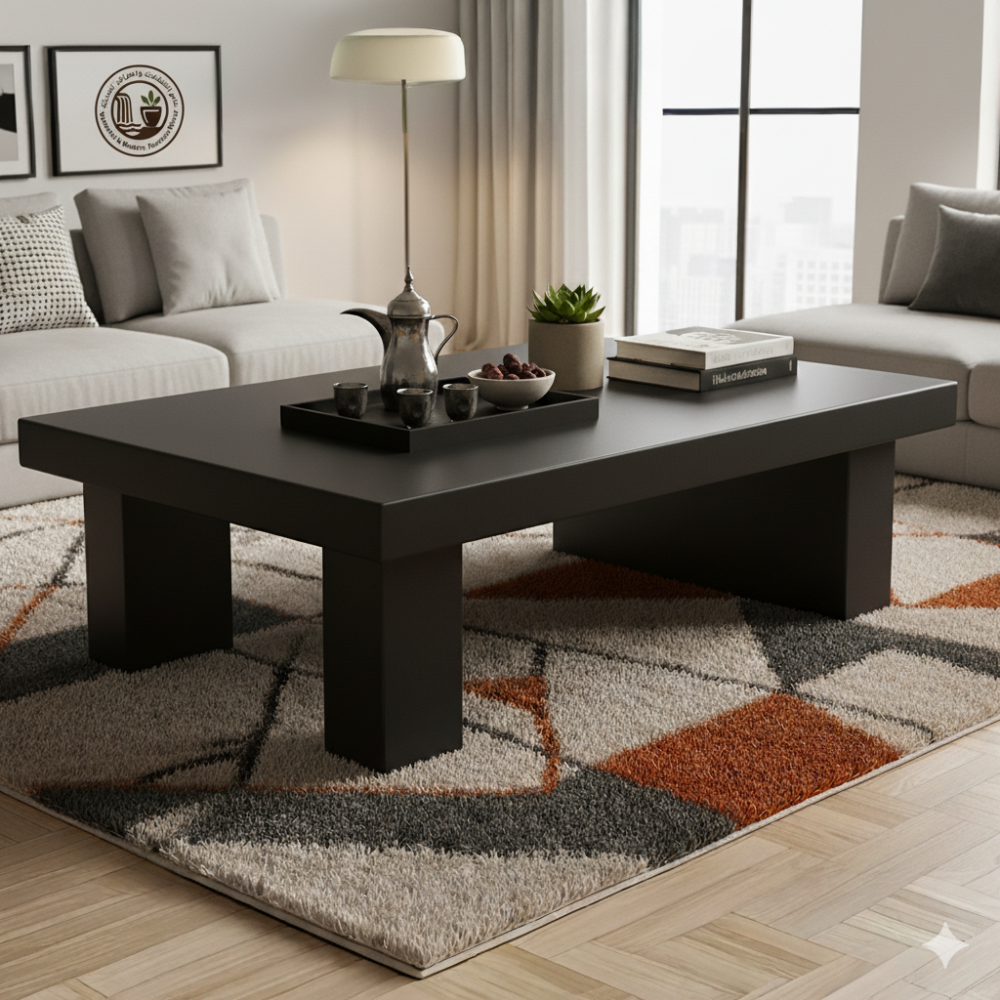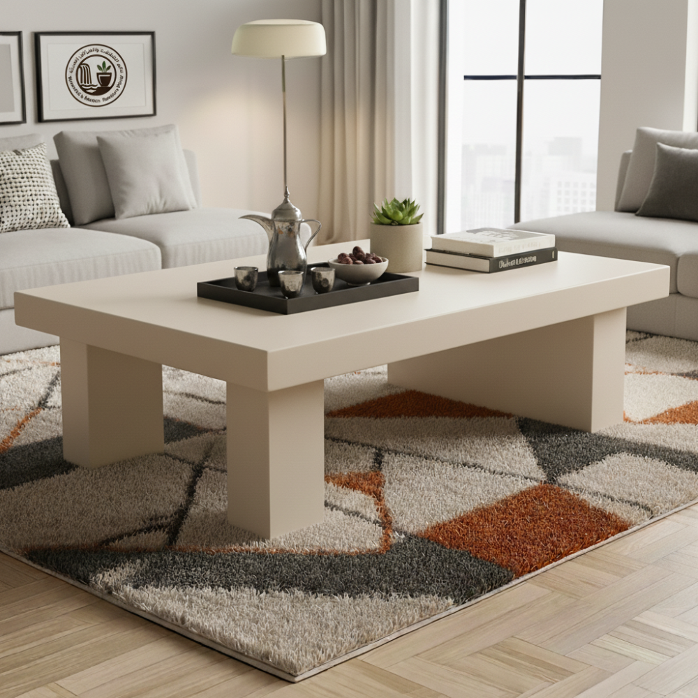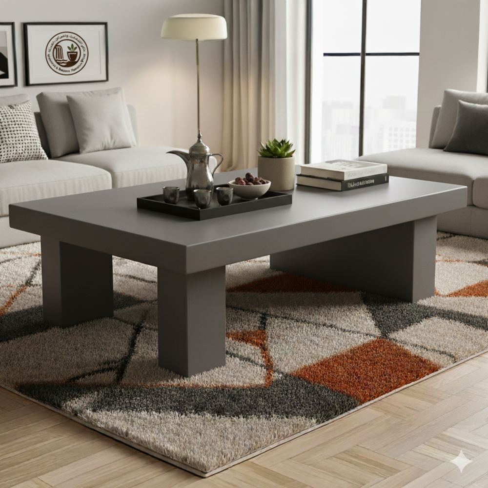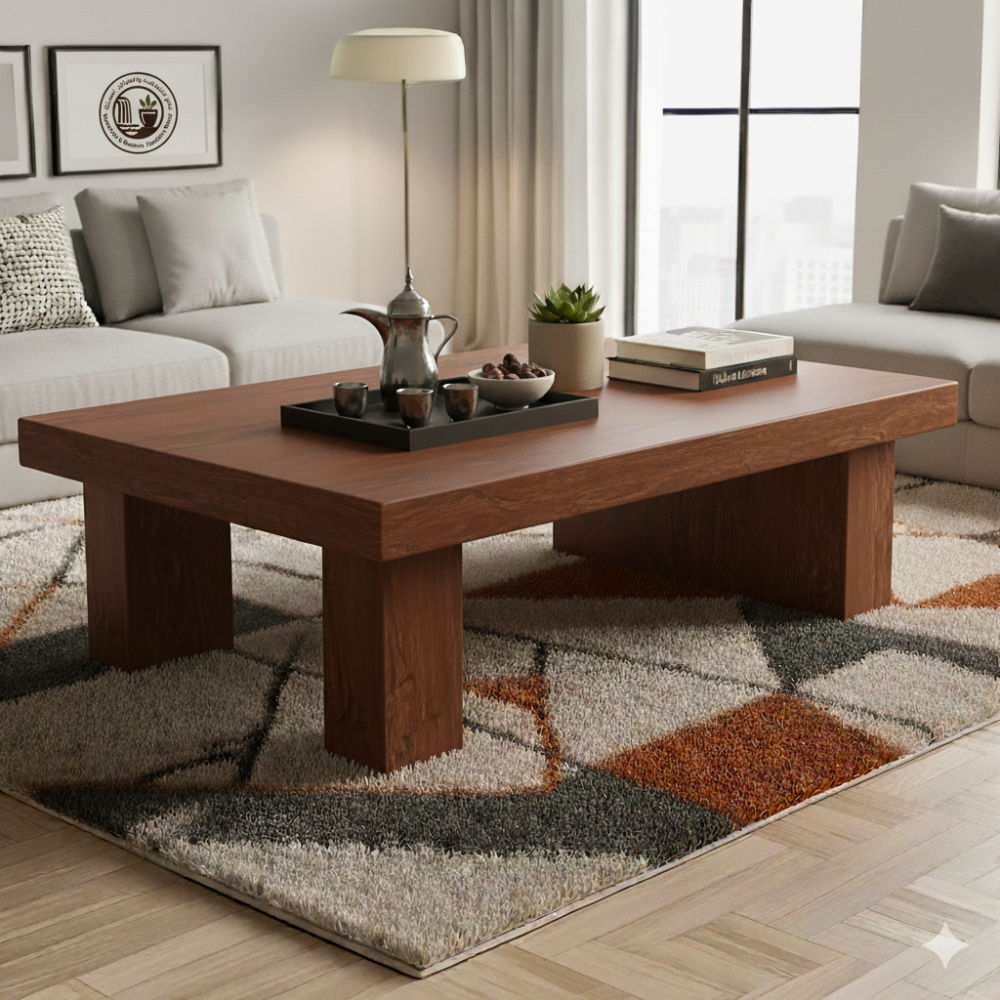 طاولة قهوة عصرية مصنوعة من الفيبر جلاس عالي الجودة بسطح وتشطيب خشبي أنيق يمنحها مظهراً طبيعياً فاخراً. تصميمها المستطيل العملي يجمع بين البساطة والمتانة، مما يجعلها مثالية لغرف المعيشة أو الصالات في الفلل الحديثة.